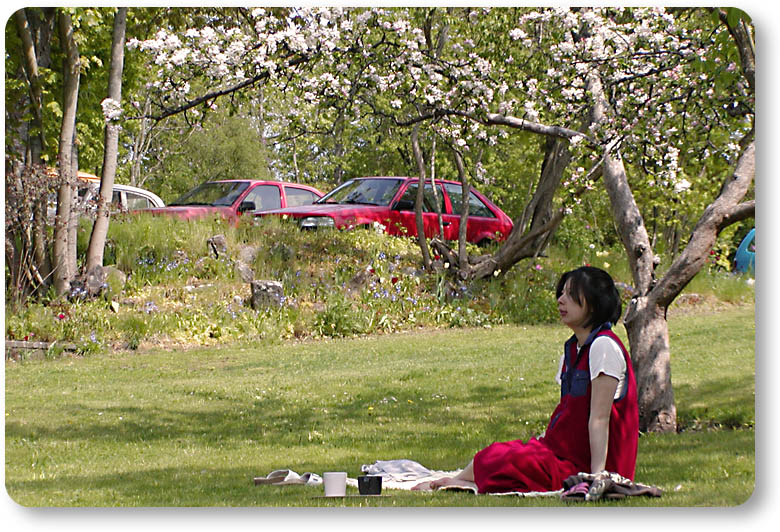 この写真は出産当日。リラックスする為に自宅前の芝生で休憩。リンゴの木には花が付いています。この時、既に陣痛が始まっていました。