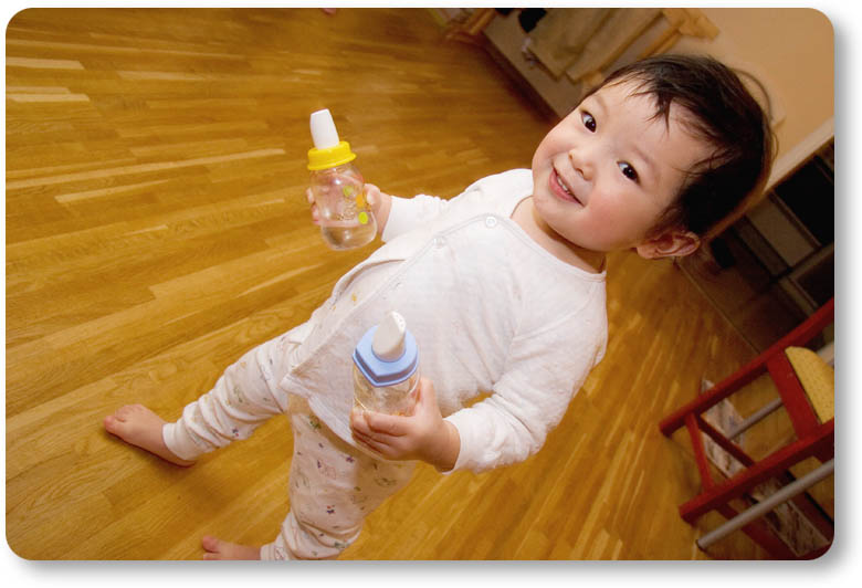 この写真は昨晩のモユル。 左右のほ乳瓶を交互に飲み変えていました。