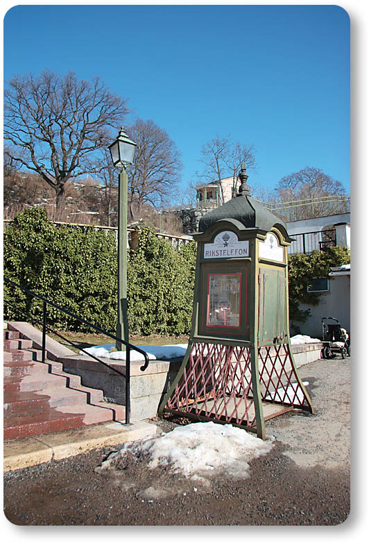 これはスウェーデンの古い電話ボックス。時々、街中で見かけたりもしますが、スカンセンにも設置されていました。もちろん使用可能な公衆電話が中にあります。
