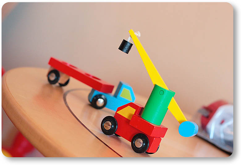 お祖父ちゃんの職場の方から頂いたこのオモチャが今のモユルのお気に入り。トレーラーに積んである荷物を、クレーン車の磁石ででつり上げる事が出来る様になっています。