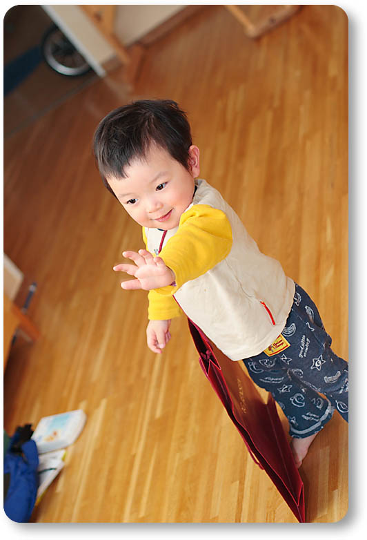 おかし〜い!何度も繰り返すなんて〜!でもモユル君ホントに楽しそう!バッグは赤いジョージジェンセンの紙袋がお気に入りなんですか?