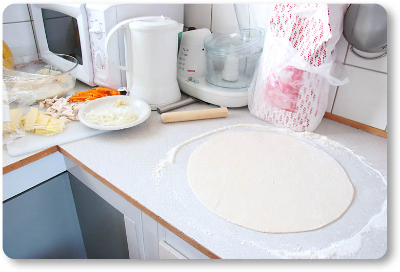 分厚い状態のそこからがたぶん頑張り所です。本当は簡単に伸ばせる生地が良いはずなのですが、なぜか我が家で作る分もうまくのびません。そこからは体力というか、力で薄く引き伸ばしましょう。