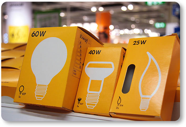 イケアの電球の箱。余分な表記は皆無、必要な情報が一瞬で分かります。