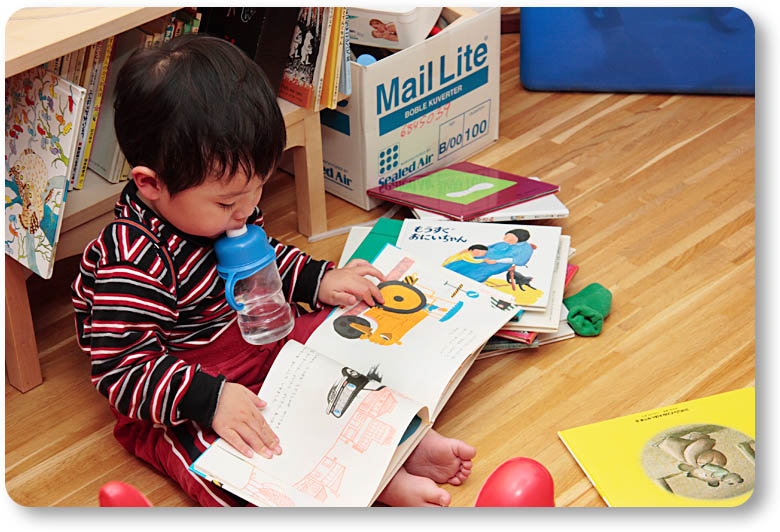 一人で読んでいる事もありますが、やっぱり一番の指定席はママのヒザの上。