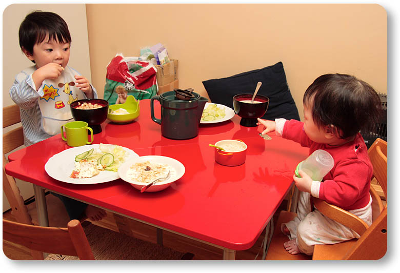 いつもの朝食はこんな感じ。我が家ではパパが朝食の係なので毎日、早起きしています。あー、ミチカさん、お水の持ち方が。。。