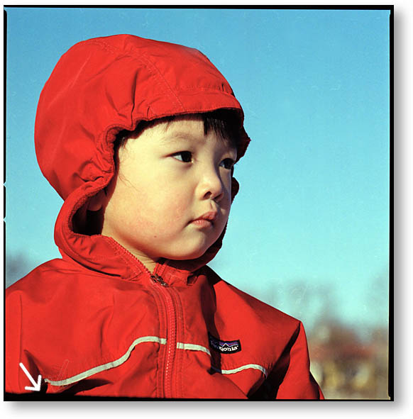 左下矢印の先を見るとなぜかフィルム枠が大きく歪んでいます。一枚だけならまだしも、全ての写真の全く同じ場所に出現。当初はフードを疑ったけど、線は比較的シャープだし、フィルム面に近いボディかなと推定。