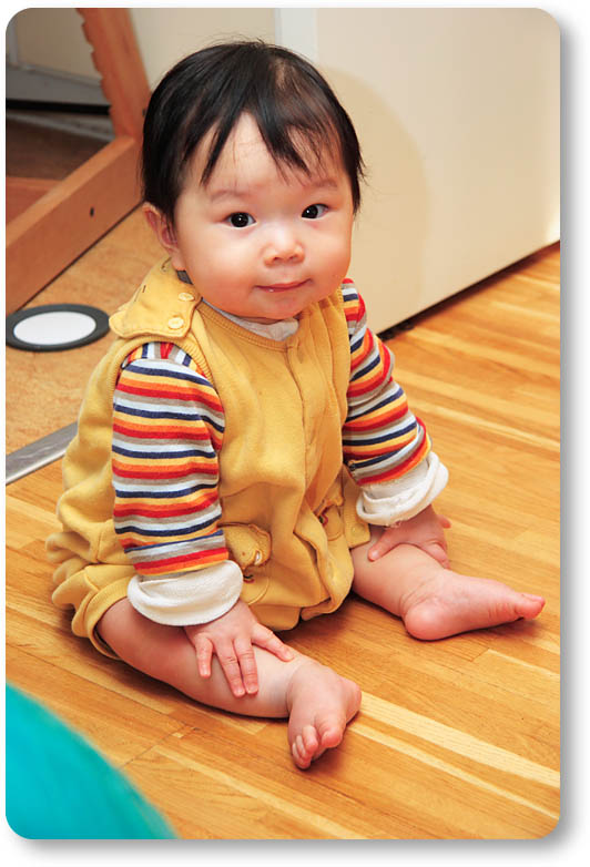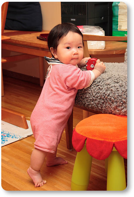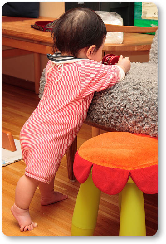 第一発見者はパパ。気付いたらいきなり椅子につかまりながらググッーと起きあがっていました。いきなりだったので、パパは大あわて(笑)。