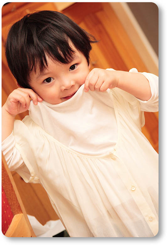 今回はモユルのファッションショー。ママが買ってきたブラウスを試着していたら、モユルも着たいと騒ぎ始めました。なんか、ネグリジェみたいね。