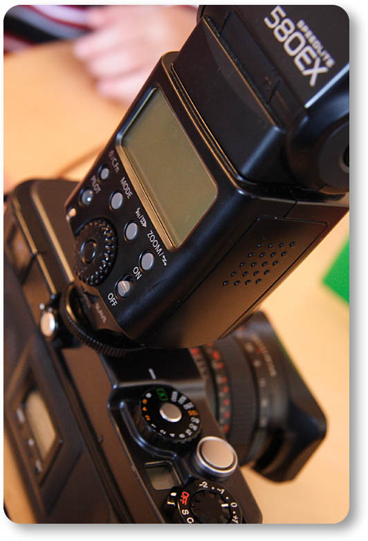 今回は以前に試していたフラッシュ撮影に再挑戦してみました。これはXPanにキャノンのTTLスピードライトを無理矢理、付けるという荒技です。TTL(自動光量調整)は全く動作しないはずなので、おそらく最大発光量になっているんじゃないかな。