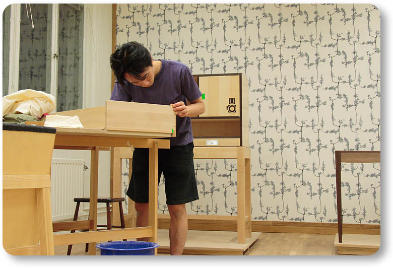 校内に撮影スタジオを設置して完成したばかりの戸棚を撮影しました。2個あるストロボのうち、一つがなぜか全くシンクロしてくれず、ちょっと手こずりました。
