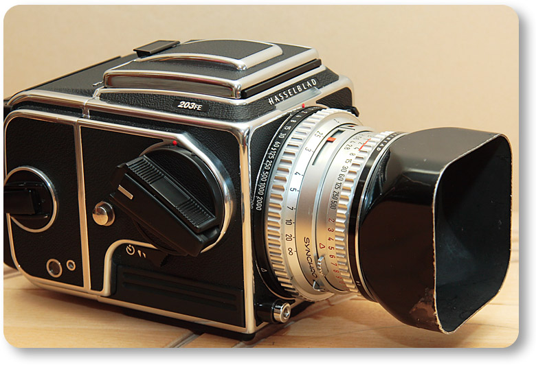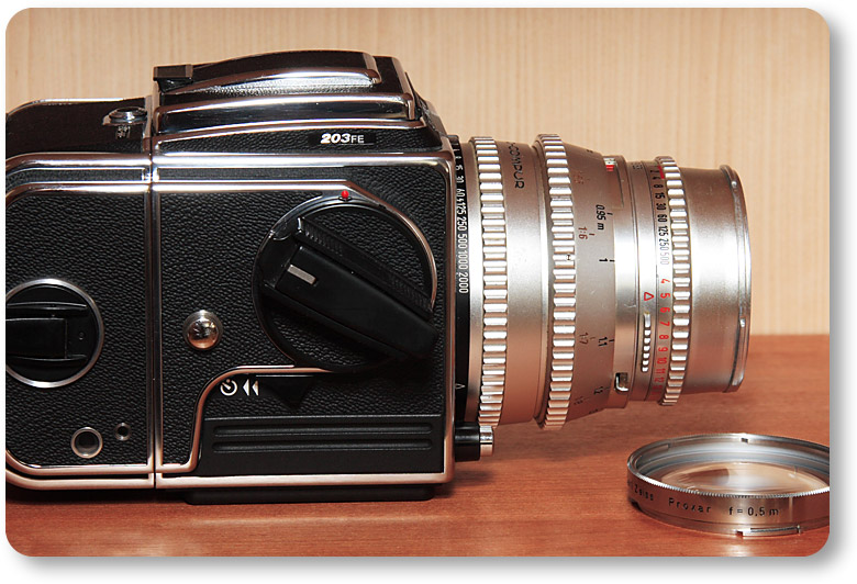 本日の装備。203FEに六枚玉のC80mm。フィルターは無し。フードは遮光効果が怪しい浅めの物(程度低)。フォーカルプレーンでの撮影なので、レンズ側のシャッタースピードはB(バルブ)に設定。フィルムはコダックの400VC。