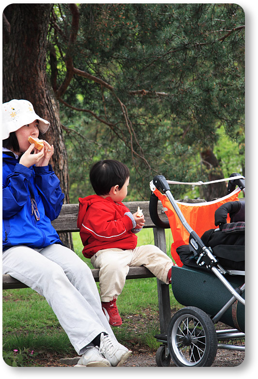 展示会場に行く前に家族みんなでランチ。天気が良かったので学校近くの教会の庭へ。パパのお気に入りの場所です。戸棚製作時などで疲れている時にここで昼寝をしたりしていました。天気が良いとすごく気持ちよい場所です。