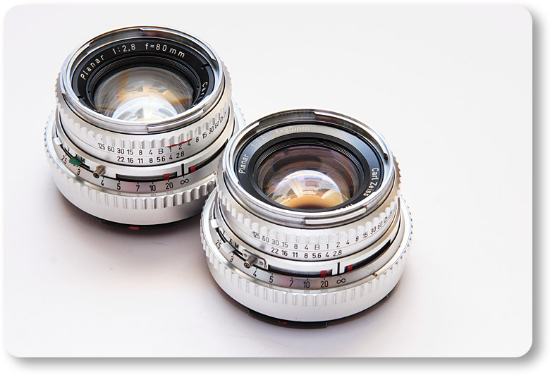 6枚玉(左)とそれ以降のC80ミリの見分け方。まずPlanarなどの字体が違います。分かりやすいのは前玉の湾曲具合。6枚玉の方が強烈です。その他にレバー形状などにも差があるけど、レンズが一番手っ取り早いと思います。