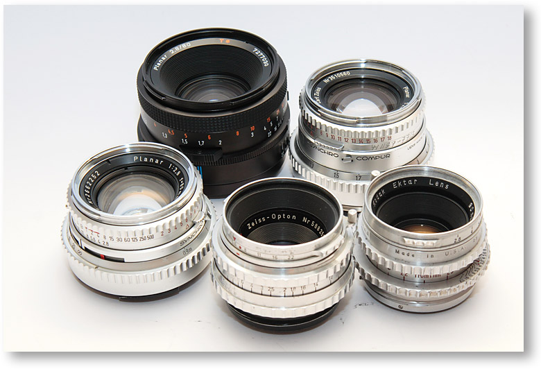 左上からプラナーFE80ミリ、プラナーC80ミリ(6枚玉)、左下がプラナーC80ミリ、テッサー80ミリ、コダックエクター80ミリ。