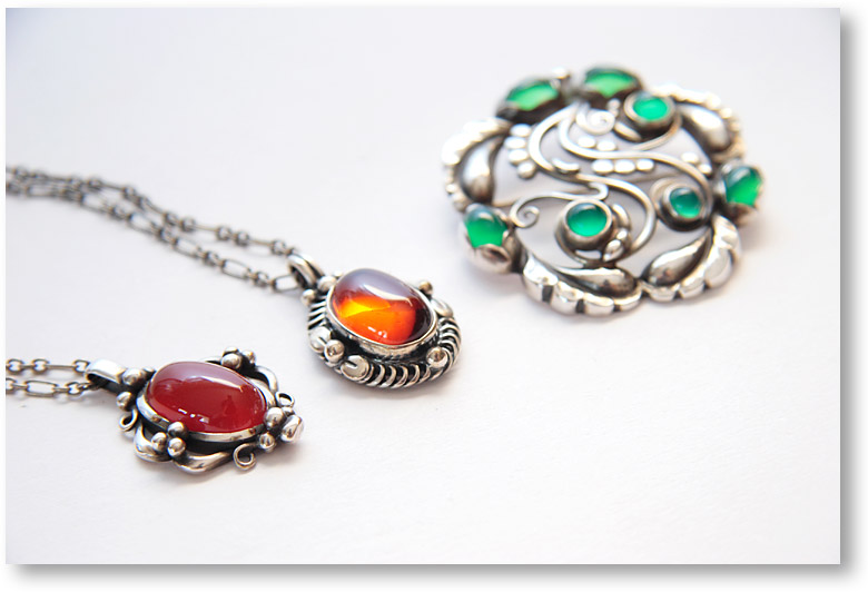 今回の被写体。ジョージ ジェンセンのアクセサリーたち。左から89年、95年のイヤーペンダント。右のブローチNo.159はグリーンアゲードがはめ込まれています。3つとも非常に入手困難な物たちなのですが、左端の89年ペンダント(カーネリアン付き)は極めて希少なモデル。超が4つくらい付くレア物(笑)です。