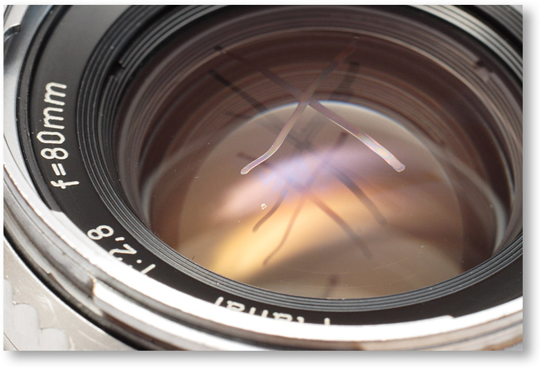 この写真では、油性マジックでレンズ中心付近にクロスの線を引いています。インクの塗膜厚と、専有面積から考えると、レンズ表面に付いた拭き傷よりも、ずっと大きな影響(入射光の邪魔をする)を及ぼすはずです。