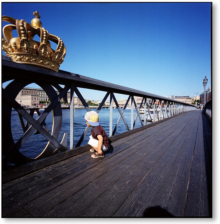 道なりに歩いていくと、島から街へ繋がる橋が見えてきます。モユルは水面を泳いでいるカモの親子に夢中。下に見えるのはパパの頭の影。。。
