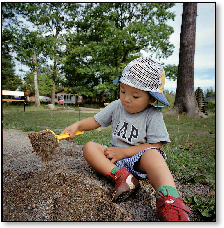 この公園はちょっと変わっていて、右奥にある緑色の大きな箱内に、大量のオモチャが収納されています。これまでに受け継がれてきた物なのだろう。モユルの持っているスコップもその内の一つです。