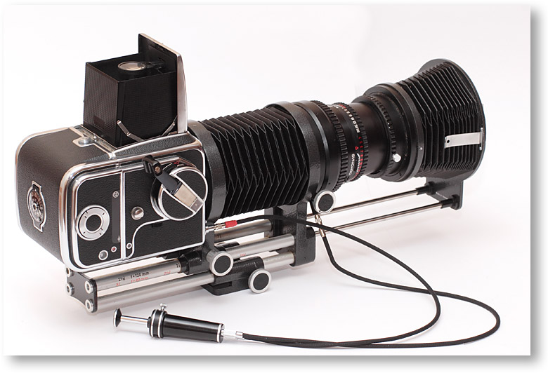 今日は接写撮影で使うベローズ(蛇腹)を紹介します。これはハッセルブラッド用の旧型モデル。ダブルレリーズが必要で、さらに巻き上げもボディー側とレンズとで別々に行わないとなりません。非常に手間がかかるので、手持ちで撮るのはちょっと無茶。(注:写真のケーブルの取り付け方は間違っています。正確には赤い目印が付いたケーブルがレンズ側になります)