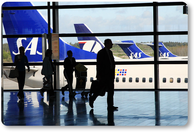アーランダ空港で。スカンジナビアン ブルー(たった今、名付けた)の尾翼が綺麗。