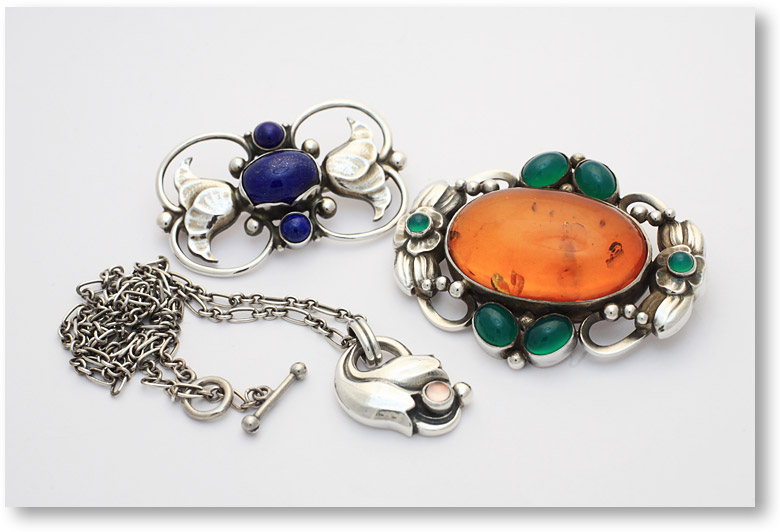 コペンハーゲンやストックホルムで見つけたジョージ ジェンセンのアクセサリー。ブローチ二つはかなりの大物。右の琥珀は特に素敵。人気のイヤーペンダントは現在、ヤフオクで出品中です。どなたか落札して下さいね。