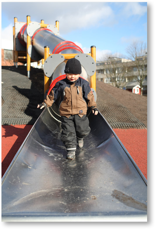 今日のお写真、滑り台?の金属部分の質感・青空の反射、赤いリングとのコントラストが素敵ですね、そこにお子さんの姿が映っているので心温まるものになっています。