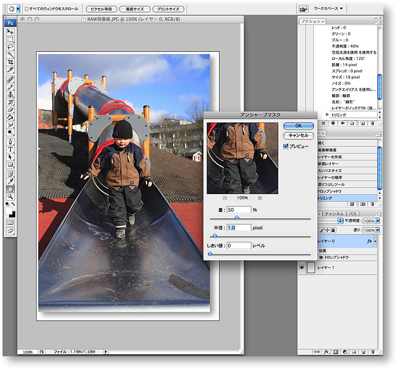 RAWはファイルサイズが重くなりますが、後処理が非常にやり易いのでお勧めです。このPhotoshopは最新のCS3ですが、紹介した機能は古いバージョン(CS2,CS,8。7もかな)でも搭載されている物ばかりです。試してみて下さいね。