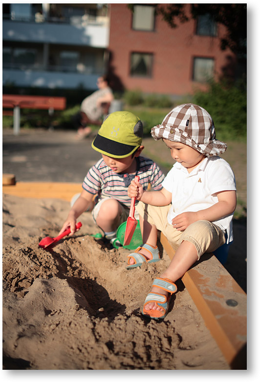 ターゲットは砂場で遊ぶ二人。動き回る子供の撮影は大変だけど、砂場だと一カ所にじっとしてくれるので撮りやすいのです。