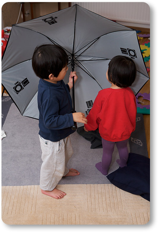 こんな感じの物を普段は使っていますが、カメラのフラッシュ光をこの傘に向けることで、光の拡散効果の拡大を狙っています。